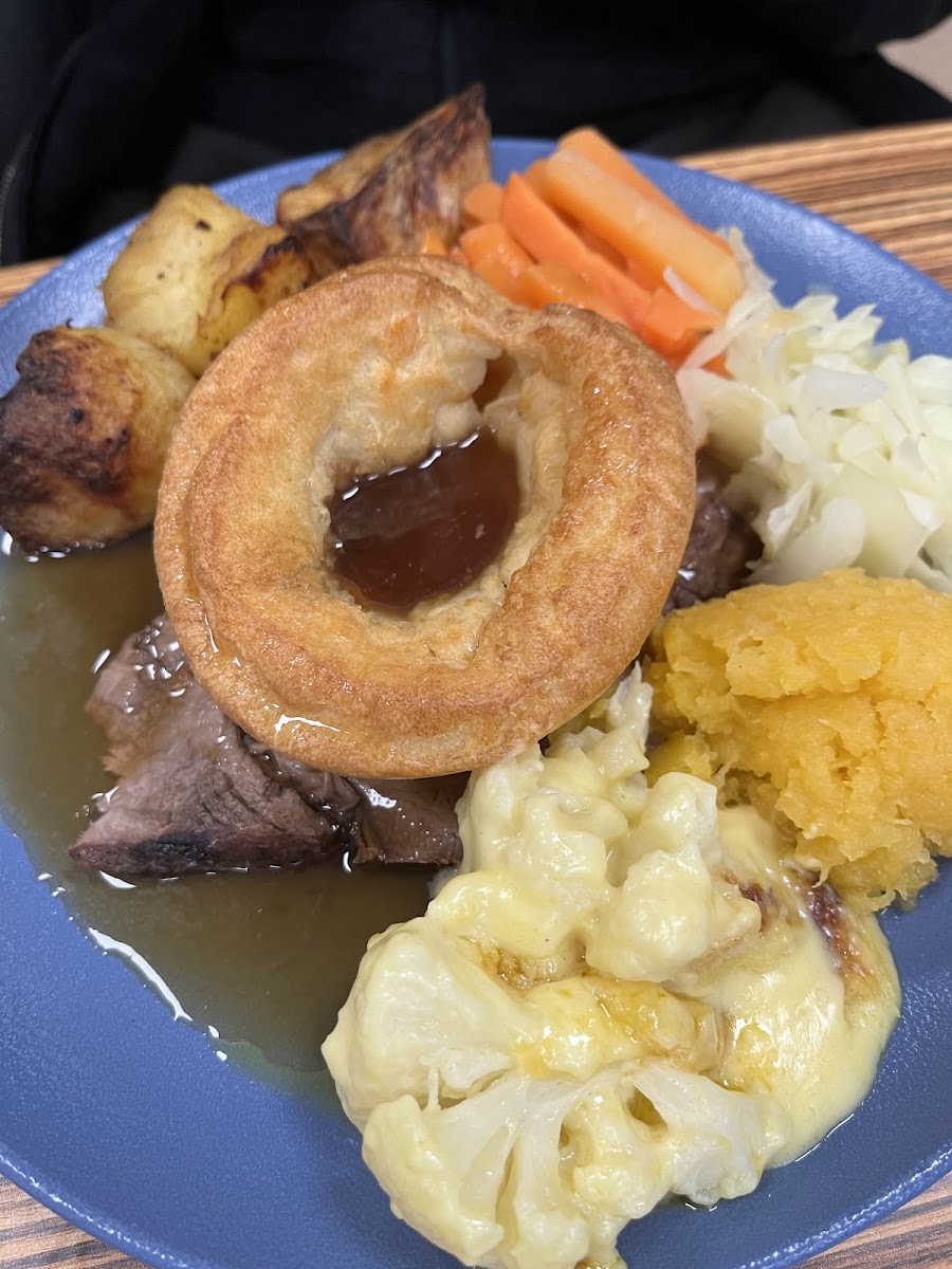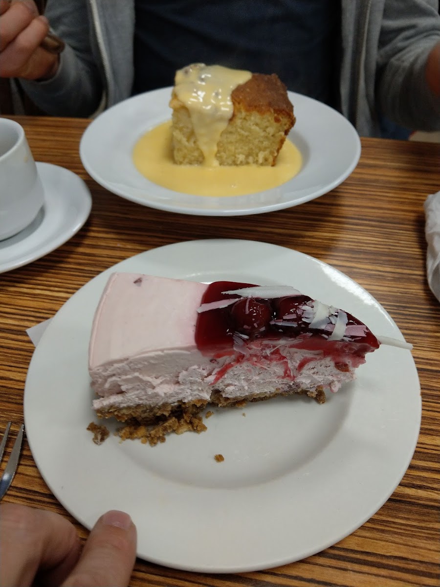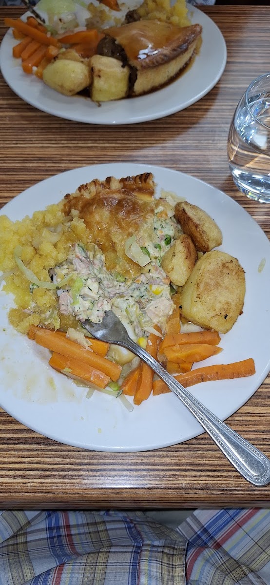 My wife had a jacket potato with cheese and beans and I had the chicken, leak and ham pie with suede, cabbage, baby carrots and roast potatoes. Then unbelievably we followed up with 2 delicious desserts. The pie was delicious. This is a cafe that serves restaurant standard food and to be honest I've had dined in so called posh restaurants and felt let down. This was super quality and honest value and comes thoroughly recommended.